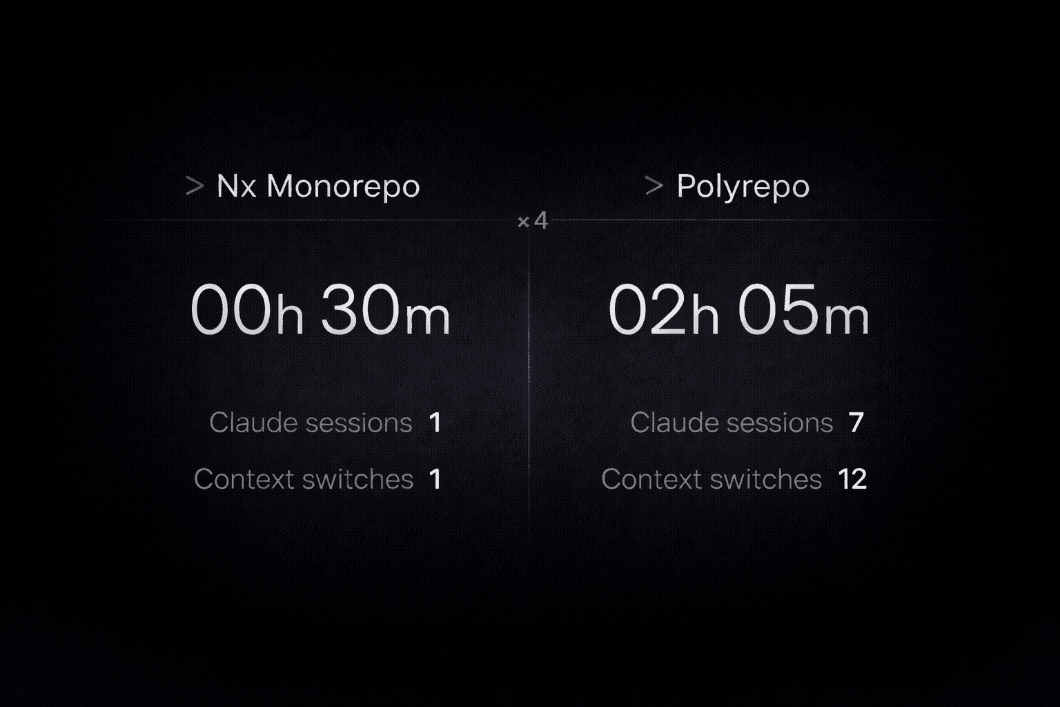 Scattered repositories force AI agents to rebuild their understanding every session—turning 30-minute tasks into 2-hour frustrations. Nx monorepos limit unnecessary manual coordination by giving AI agents full codebase awareness to be accurate, efficient, and autonomous— at scale.